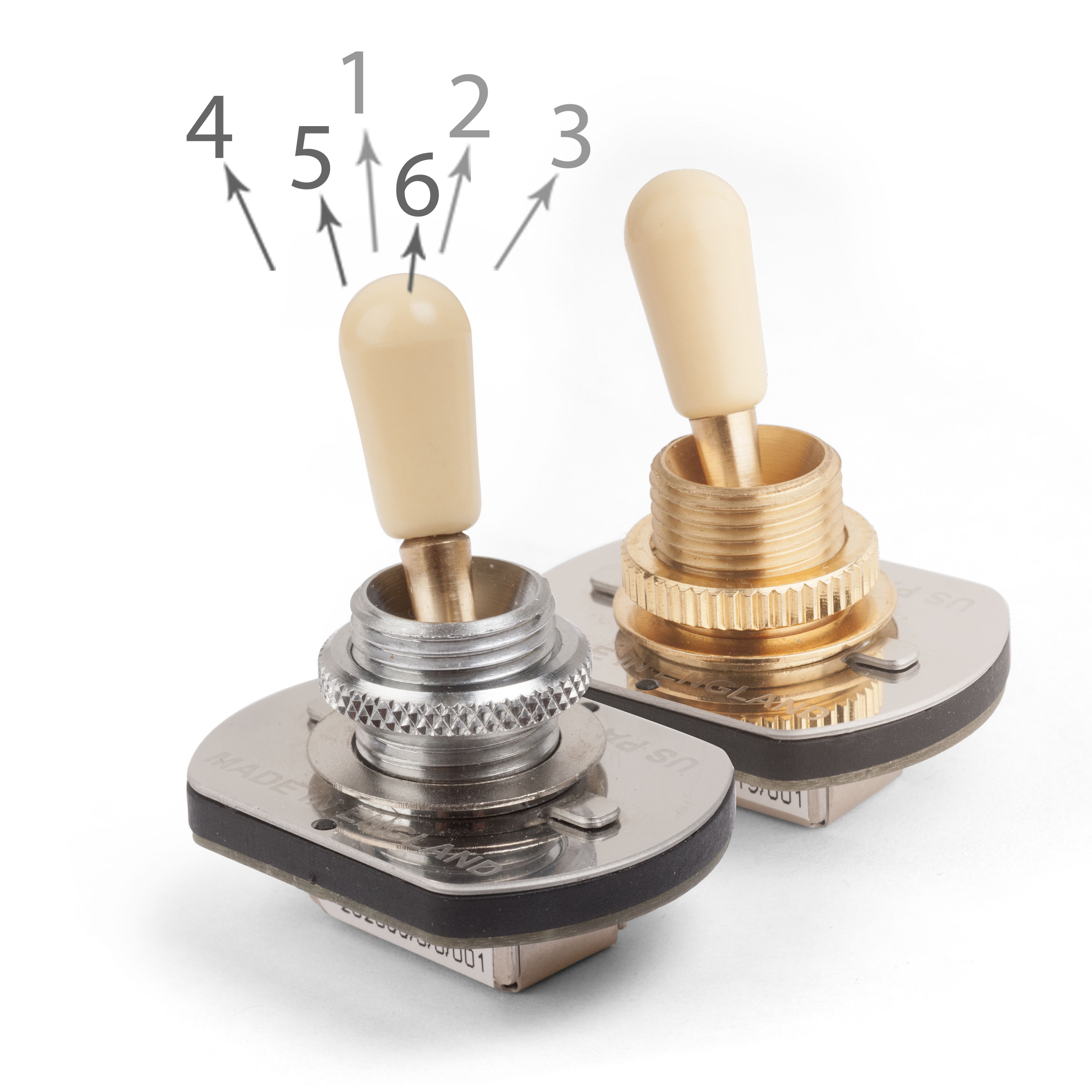 6-way guitar gearshift! It does the work of multiple standard switches: 2-pole, 6-position transverse toggle action broadens wiring options and tone possibilities. Great for coil-splitting, 3-pickup selection, piezo pickup activation, and humbucker / single-coil / humbucker switching.