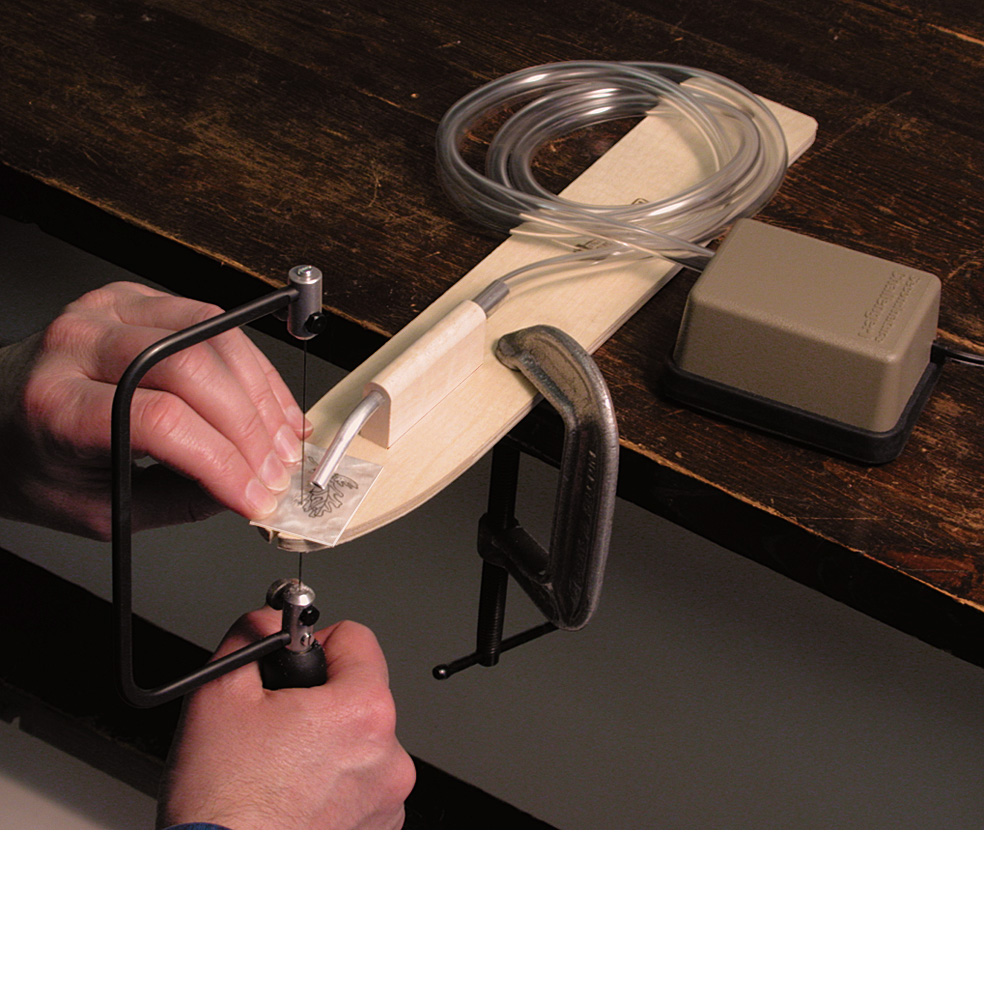 Cutting platform has a blower nozzle that connects to a gentle air stream, keeping the pearl dust-free as you work.