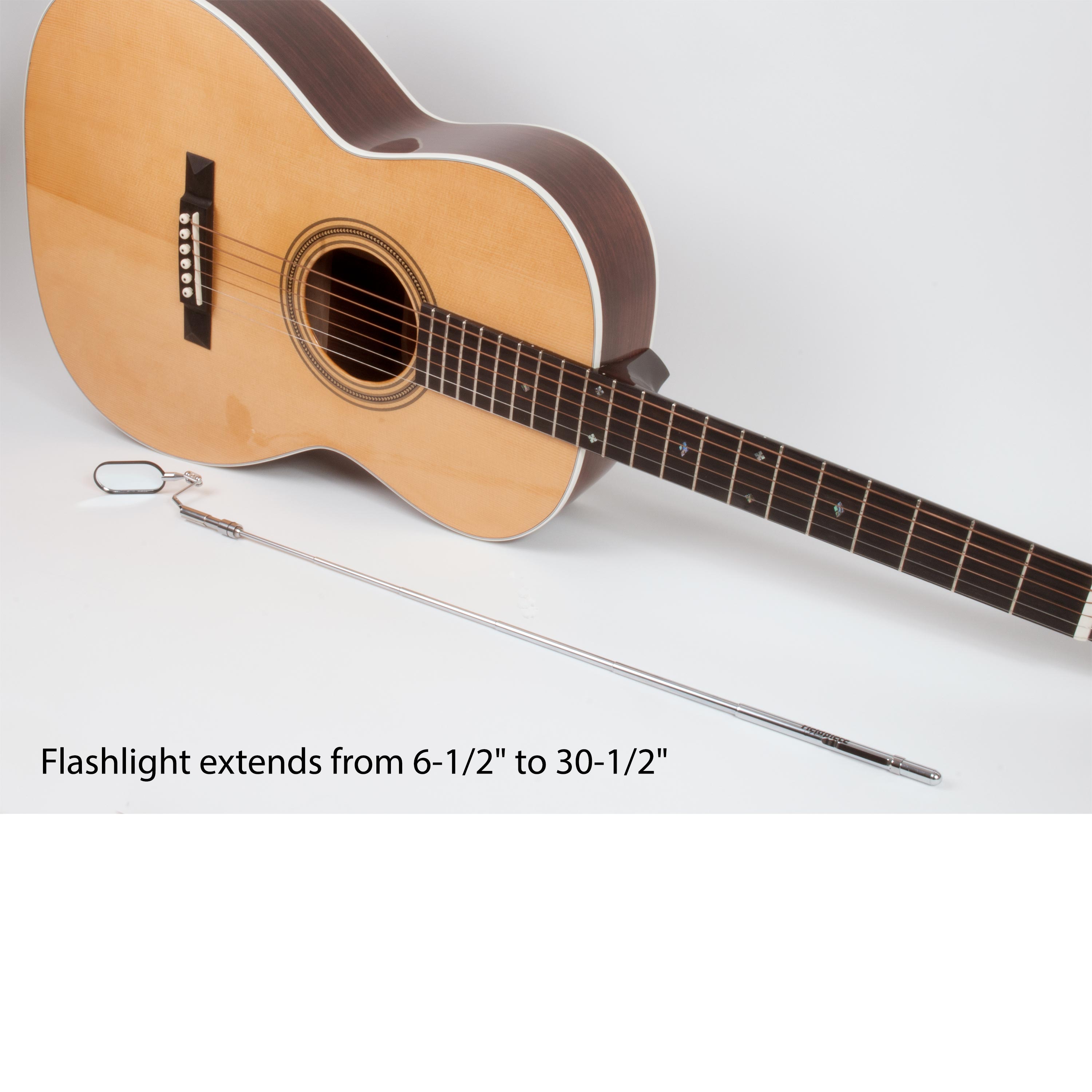 This versatile tool is a combination LED mini flashlight and handy swivel-jointed mirror attachment that adjusts in any direction. It telescopes waaaaay out, to let you illuminate and inspect areas deep inside large instruments where most mirrors can't reach. It's slim enough to fit into mandolin and uke soundholes, too—one tool does it all. The reliable lifetime LED light reflects off the mirror to shine where you need it. Easily detach the mirror to use the tool as a standalone flashlight. Convenient pocket clip included.Flashlight extends from 6-1/2" (165.1mm) to 30-1/2" (774.7mm)