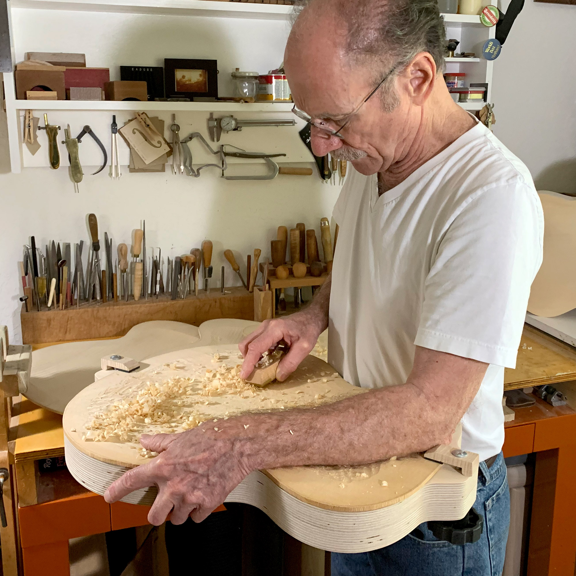Making an archtop guitar is no small feat, and the hardest part by far is carving the top and back. You not only need to hold the plates securely, but you also need the freedom to carve from any angle. As seen in his classic Archtop Guitar Design and Construction book, Benedtto designed the perfect solution to give you complete control of your archtop build from beginning to end.