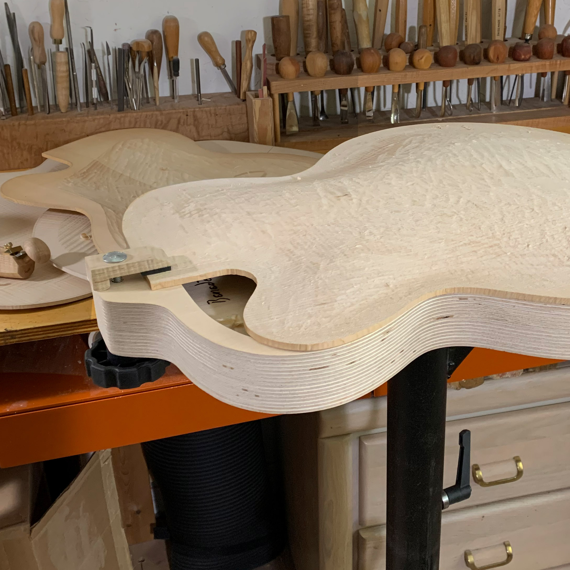 We include two clamp extender blocks to secure an assembled body. This puts the guitar in the perfect position to scrape the re-curve in the top and back. This is critical to shaping the voicing of the guitar. The clamp footprint is small to stay out of the way as you carve.