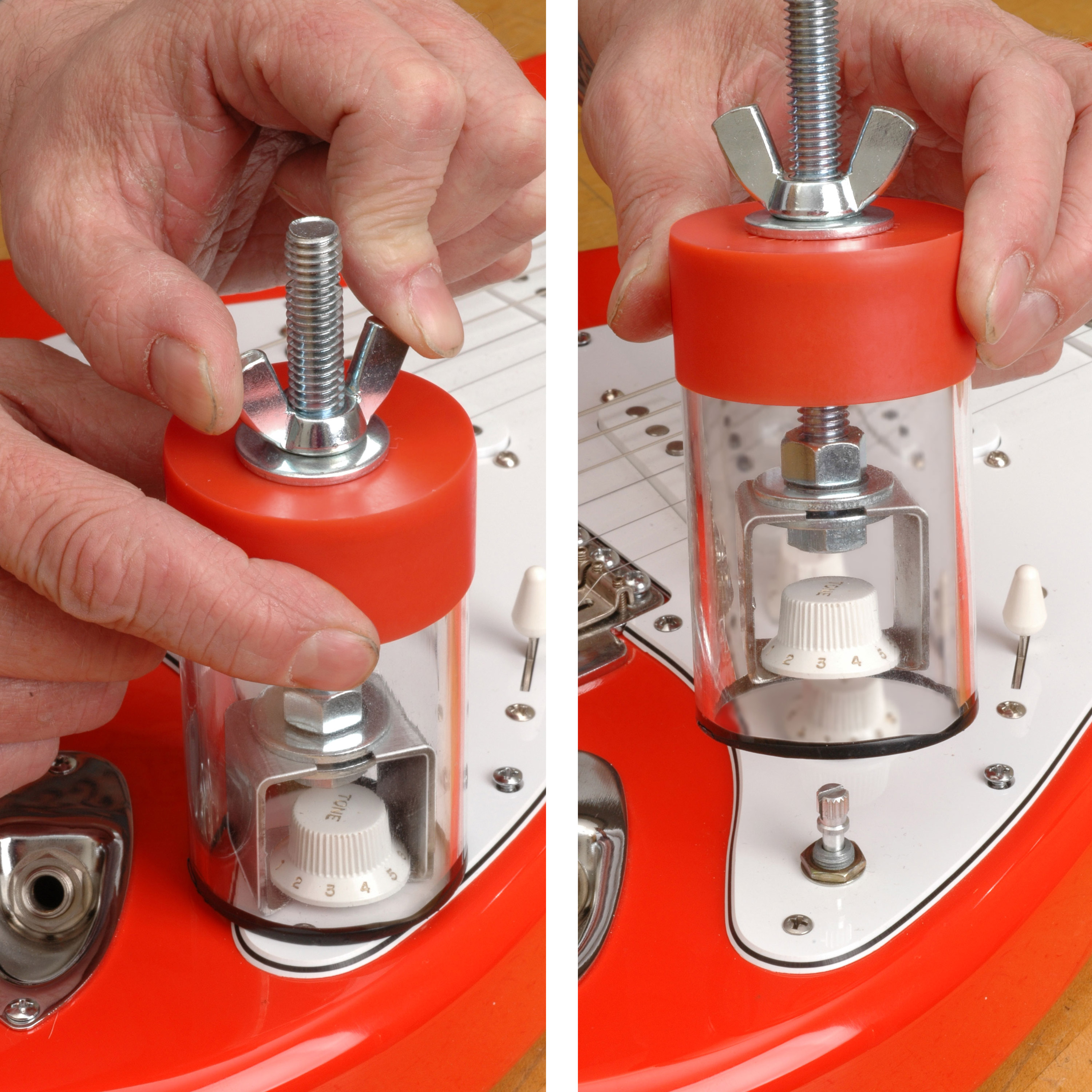Stubborn hard-to-remove guitar knobs?The Knob and Bushing Puller's clear acrylic housing has a rubberized base to help protect the guitar's finish. Includes hardware to easily extract Gibson, Schaller or Gotoh bridge and tailpiece stud bushings, without damaging the guitar.