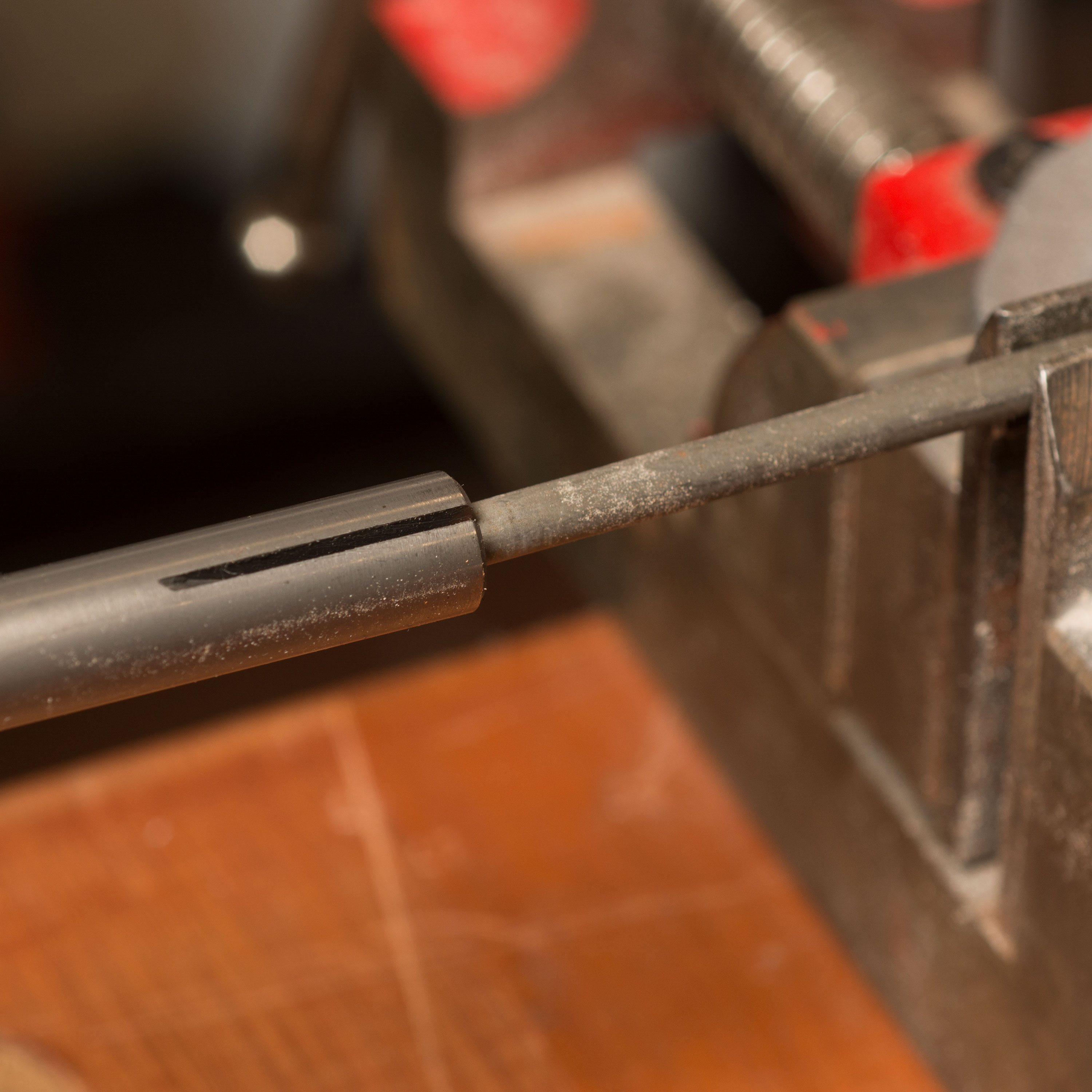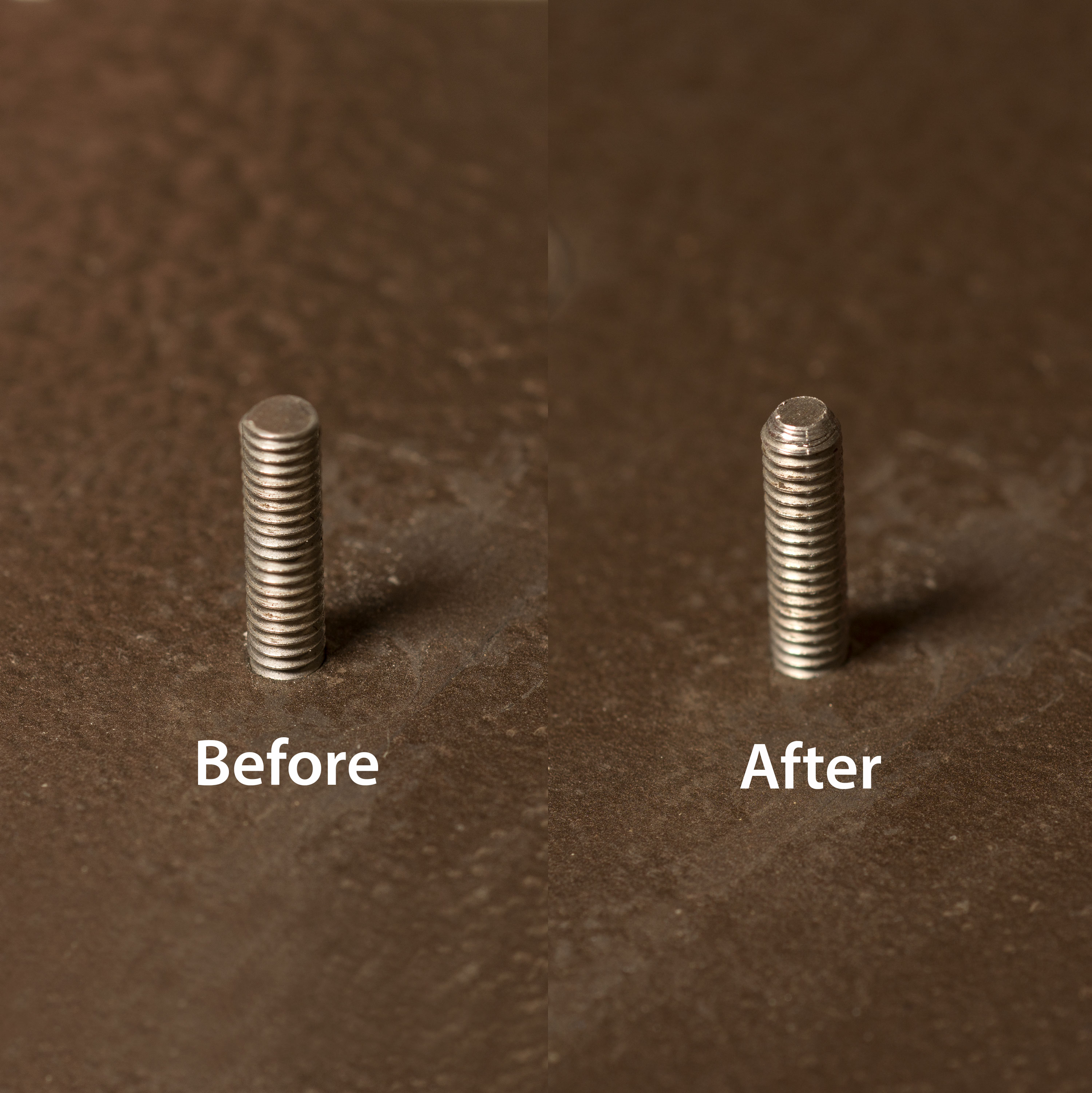 A specialty tool designed to put a clean chamfered edge on trimmed truss rods and machine thread screws. Use with light pressure in your hand drill.