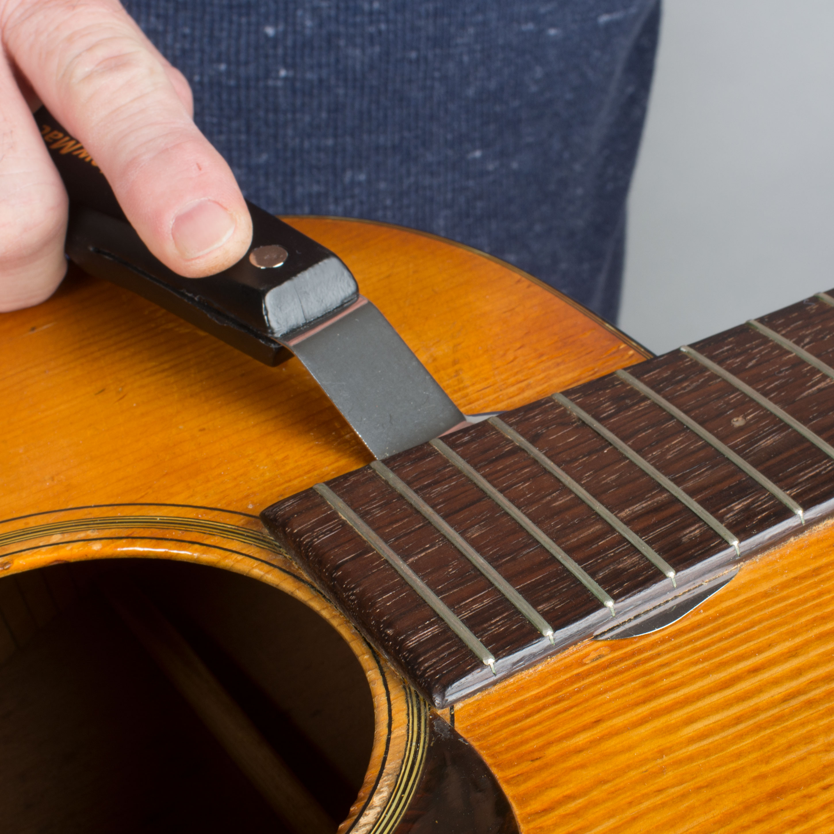 The steel blade has a comfortable wood handle and versatile shape for removing a bridge, pickguard, or fingerboard extension from an instrument. The tapered blade helps separate glue seams easily.