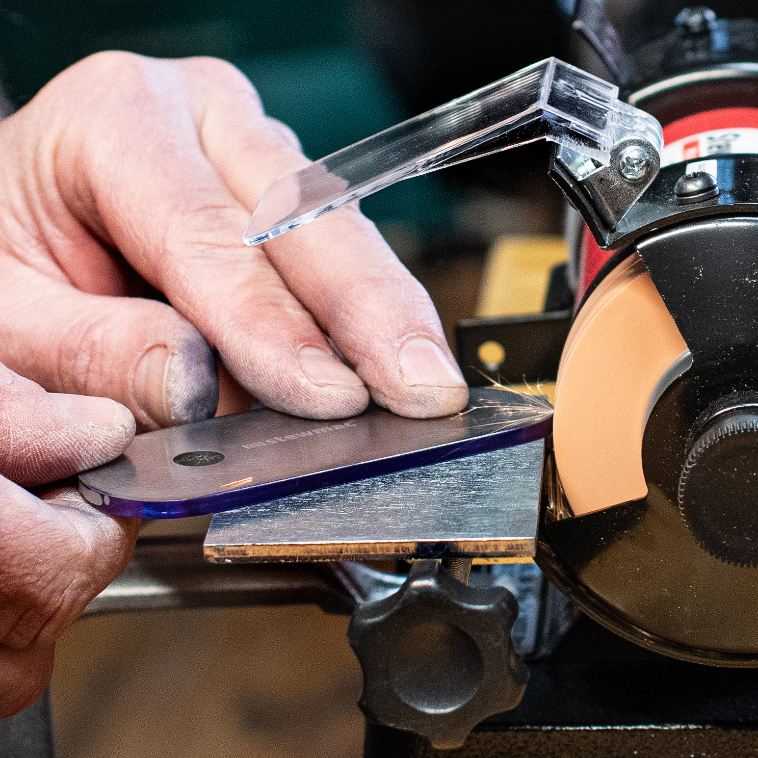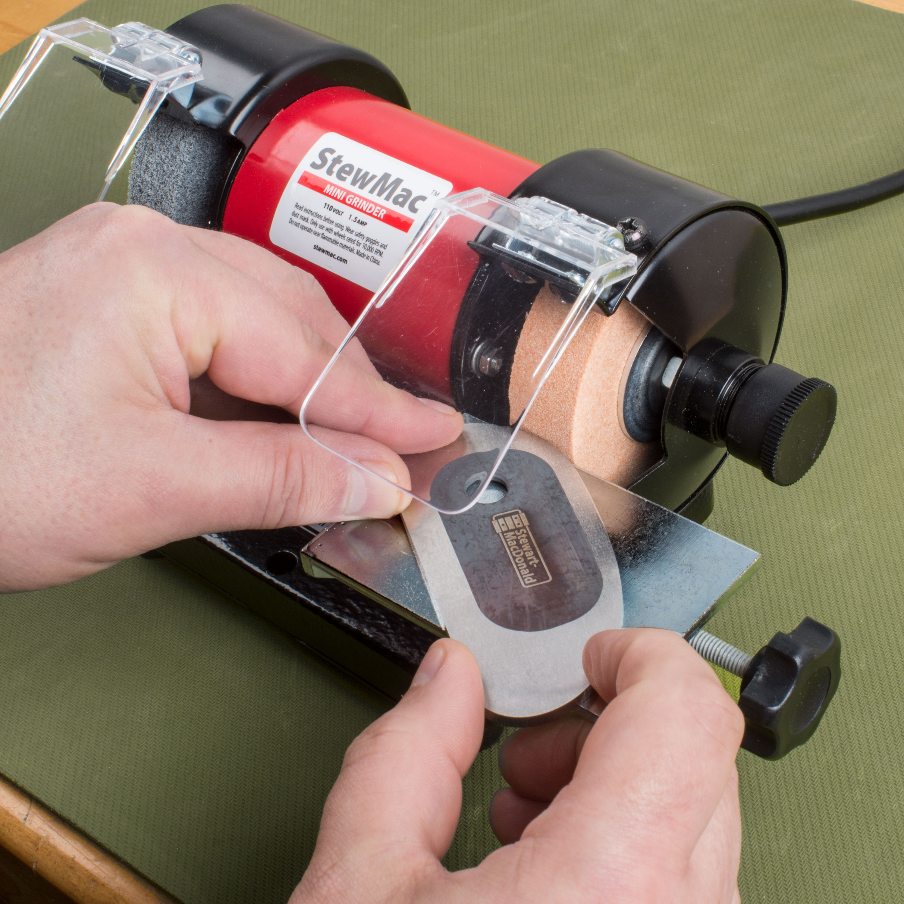 Sharpening our Ultimate Scrapers has never been so simple: Place the scraper face down on the large table and move the edge slowly and easily across the wheel—in a matter of seconds it will be sharp and ready to get back to work. Grinder setup and sharpening instructions included.