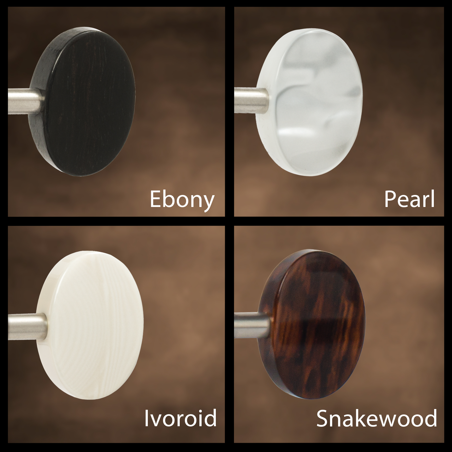 - Handsome white powder-coated aluminum string rollers have brass inner shafts and brass-lined string mounting holes. No cracking, no premature wear.