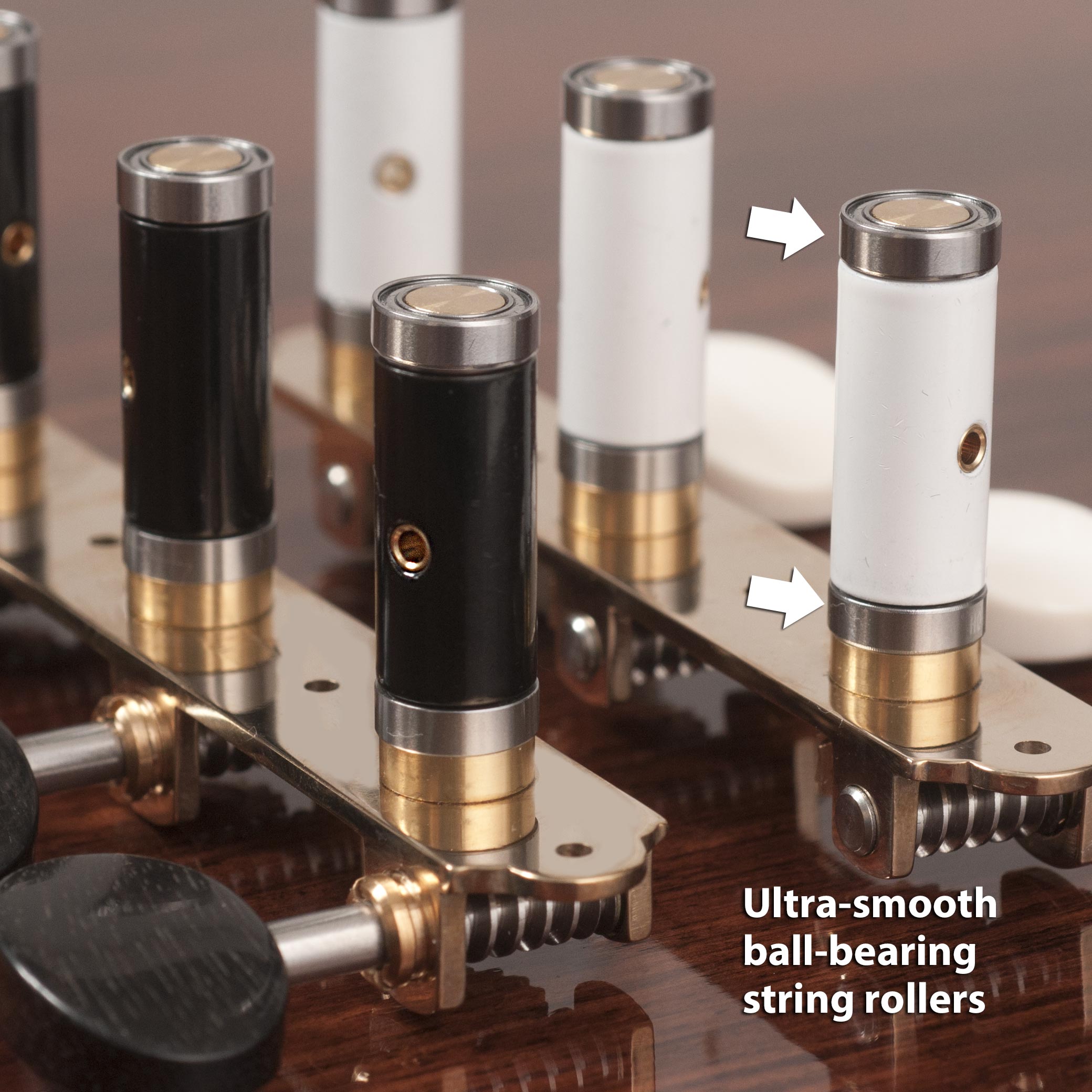 - Precision ball bearings on each string roller prevent binding—a new level of smooth, effortless tuning for the performing artist.
