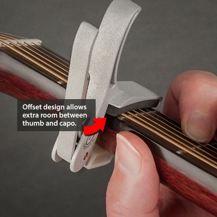 The world’s first offset capo. Grover's innovative offset design gives your hand a little more room than a traditional capo—a real plus when forming that tricky B7 chord. It goes on (and off) fast. Made of lightweight aluminum, with a matte finish.