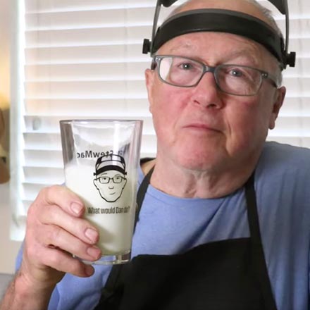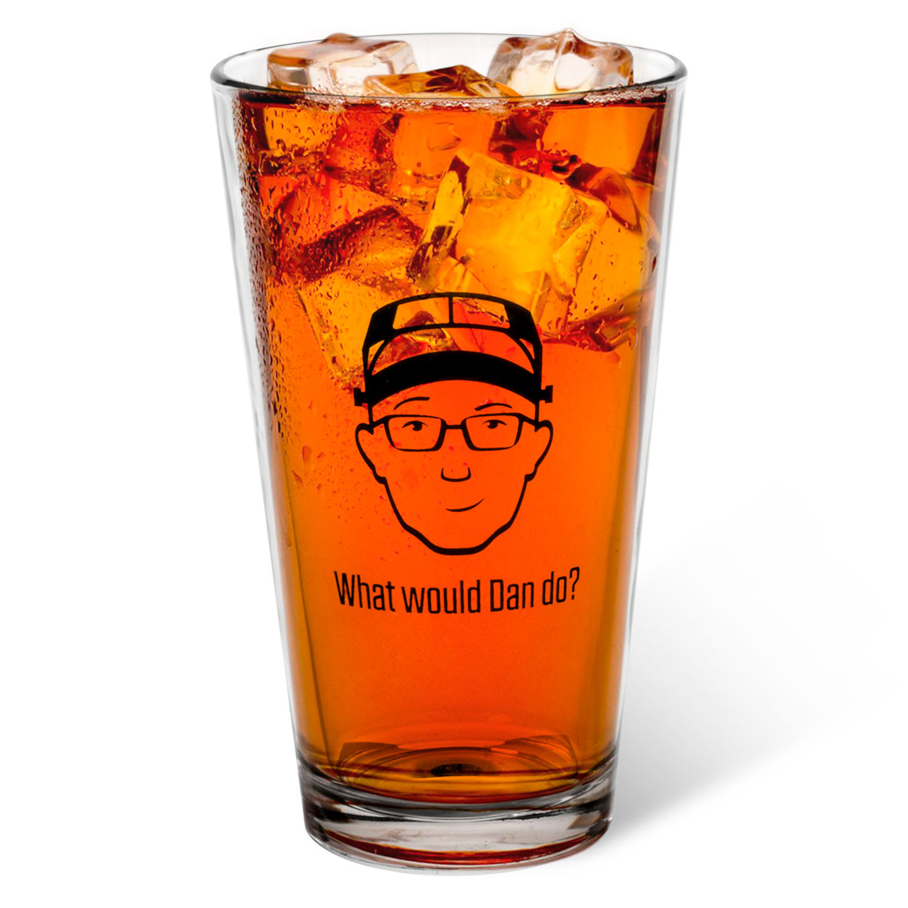 We took that idea and combined it with this awesome sketch of Dan in his beloved OptiVISOR. We thought, "We all love Dan, and everyone loves a cold drink, what's more perfect than a pint glass?"