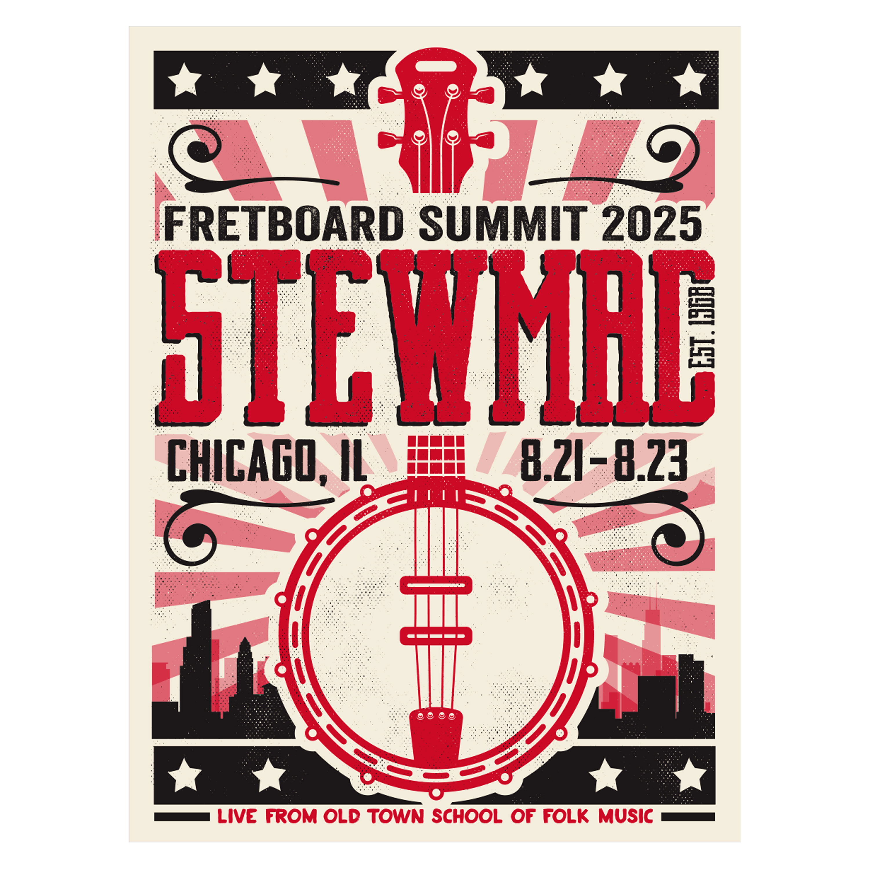 Get your hands on this exclusive 18x24 screen printed poster. Designed especially for this year’s Fretboard Summit, each print was hand-pulled in New York City by Ladykiller Press. Only 100 were made, making this a rare piece of StewMac and Fretboard Summit history that belongs on your wall.