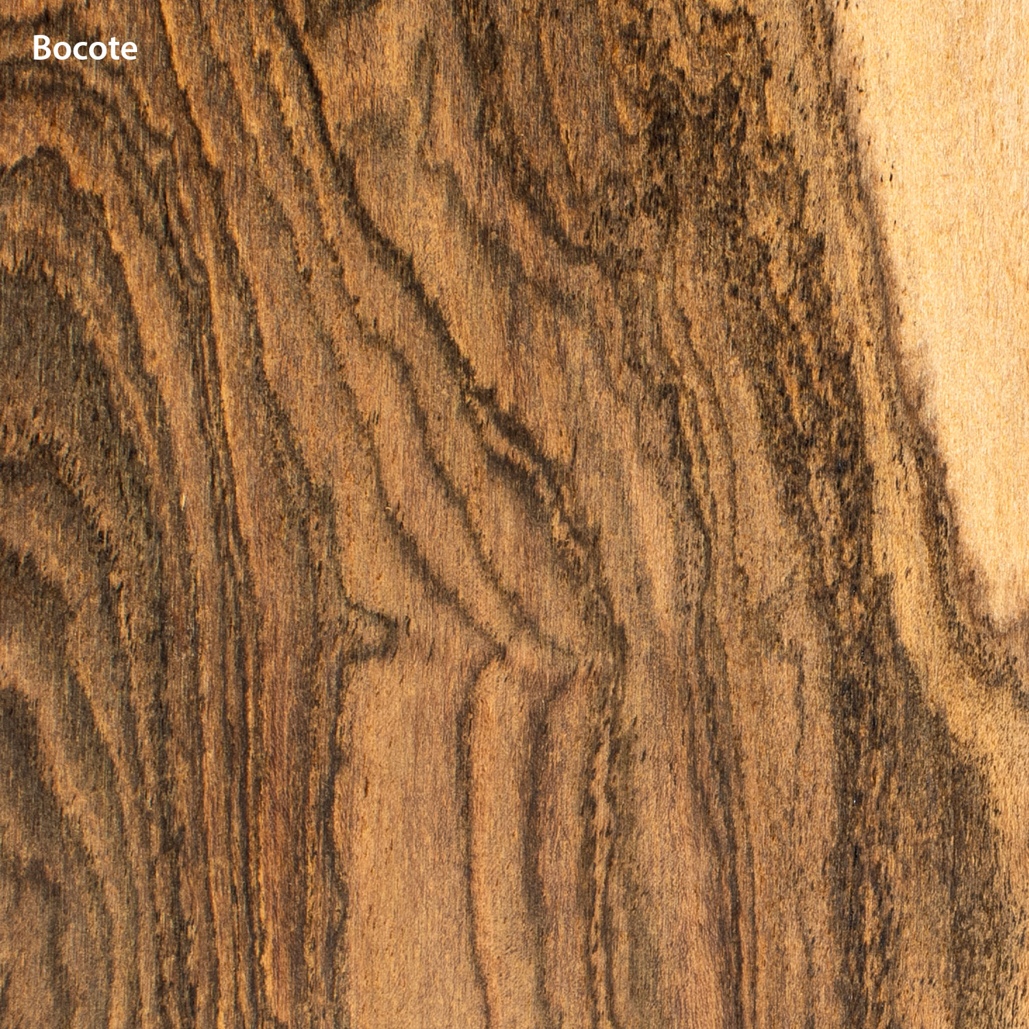 Bocote (Cordia spp) is a visually stunning tonewood, prized for its dramatic grain patterns, deep contrast, and exceptional resonance. Sourced from Central and South America, its golden-brown hues and bold black streaks create instruments that look as captivating as they sound.