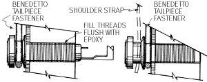 Illustration "A" shows the Benedetto tailpiece fastener looped around the brass button of the endpin jack. Illustration "B" accommodates a shoulder strap. Note how the Benedetto tailpiece fastener loops around the epoxy-filled threaded shaft of the endpin jack. The brass button is now free to accept a shoulder strap. |
