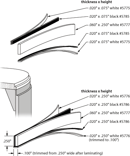 To do a lamination with many layers, we suggest that you laminate two- or three-ply pieces, then laminate those together in a separate operation. It's difficult to apply acetone to more that two or three pieces at a time. Laminations can be applied to the bottom edge of binding in the same way. If you're adding edge laminations to a piece you have already laminated, it's important to trim the edge clean and square to get a good joint and a clean appearance. This can be done with a sharp cabinet scraper after the first lamination has dried well (about 24 hours).