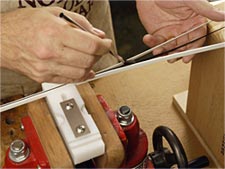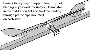 The top slider's spring tension adjusts automatically for various binding widths and thicknesses. For best results, hold the jig in a vise or mount it to your workbench to keep both hands free. In addition, support the binding strips coming in and going out of the jig. This makes it easier to keep the pieces aligned at the point of pressure.