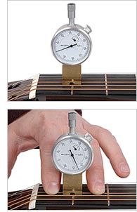 Your most accurate measurement is at the first fret. Although this tool can be placed at other points along the neck, we recommend using it at the first fret for maximum accuracy. The proximity to the nut keeps the string rigid at the first fret, and gives the most accurate reading. As you move up the neck (the 12th fret, for example), the string is much less rigid. Even the weight of the dial indicator's plunger is enough to push the string down, giving a false reading. For taking measurements higher up the neck, we recommend the String Action Gauge.