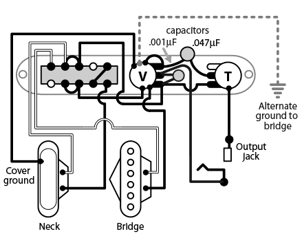 Minor modification to the neck pickup is necessary for this setup. The cover must be disconnected from the black lead of the pickup, then run to the ground with separate lead wire.