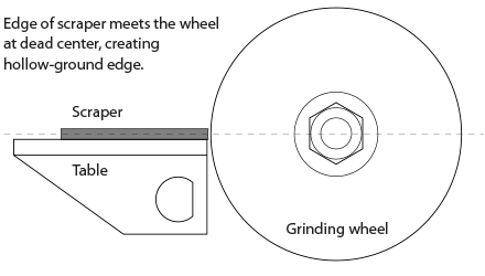 Turn the grinder's speed control to the one o'clock position. Place the scraper on the table. In a smooth even motion, move the scraper edge across the wheel to grind the edge. Check your results by examining the magic marker. If you're correctly centered the grinding wheel, the marker ink will be removed at the center of the scraper edge. If you're too high or low, adjust the table and reapply the magic marker.