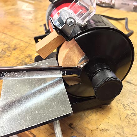 Raise the grinder speed to about the four o'clock position, and sharpen your scraper with smooth continuous motion across the grinding wheel.