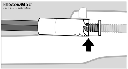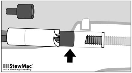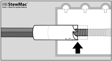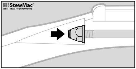 Some Fender necks have a bullet truss rod nut at the peghead. These have a slightly narrower truss rod cavity. To center the wood cutter on these, we provide a brass pilot bit. Inserted in the cutter, this pilot keeps the cutter centered until the cut is well started; after that you can remove the pilot and continue cutting normally.