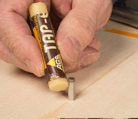 Fit the guitar top onto the pin, laying it flat onto the plywood workboard. The measurement holes in the base of the jig are a snug fit on the pivot pin. Lubricate the end of the pin with Tap-Ease Cutting Lubricant or wax for smooth rotation.