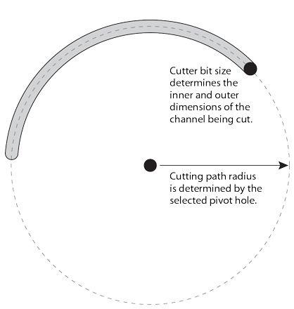 The pivot hole determines the radius of the cutting path. The cutter bit size determines the inner and outer dimensions of the circle being cut. With a 1/8" bit, the jig creates circles ranging from 2-1/8" to 5" in diameter.