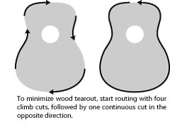 Wood tearout is always possible when routing, but especially with long-grain quartersawn tonewoods. Therefore, start with four "climb cuts," so-called because the router is climbing, or being pulled along as the bit grabs the wood.