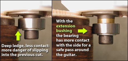 A small extension bushing is provided to set the bearing 3/32" (2.38mm) away from the bit. When routing multiple passes with relatively tall binding, it's a good idea to place the bushing between the bearing and the cutter to avoid the possibility of the bearing dropping into the previous cut.