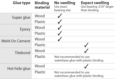 Our bearings are sized for exact cutting depth. Remember to allow for swelling of wood fibers from gluing, as well as for the thickness of the glue itself. Glued plastic binding will swell considerably as it absorbs the glue solvents. Wood bindings glued with wood glues that contain water will swell also. Without an extra .010", swollen bindings will overhang the ledge, requiring extra scraping and sanding.